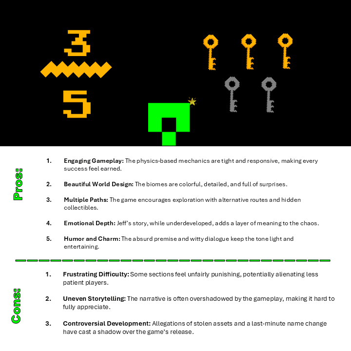 It’s a touching concept, but the execution is uneven. The narrative often takes a backseat to the gameplay, leaving players too frustrated to fully appreciate Jeff’s journey. That said, the moments of introspection—like when Jeff reflects on his relationship with his father—are genuinely poignant. It’s just a shame they’re buried under layers of rage-inducing gameplay.