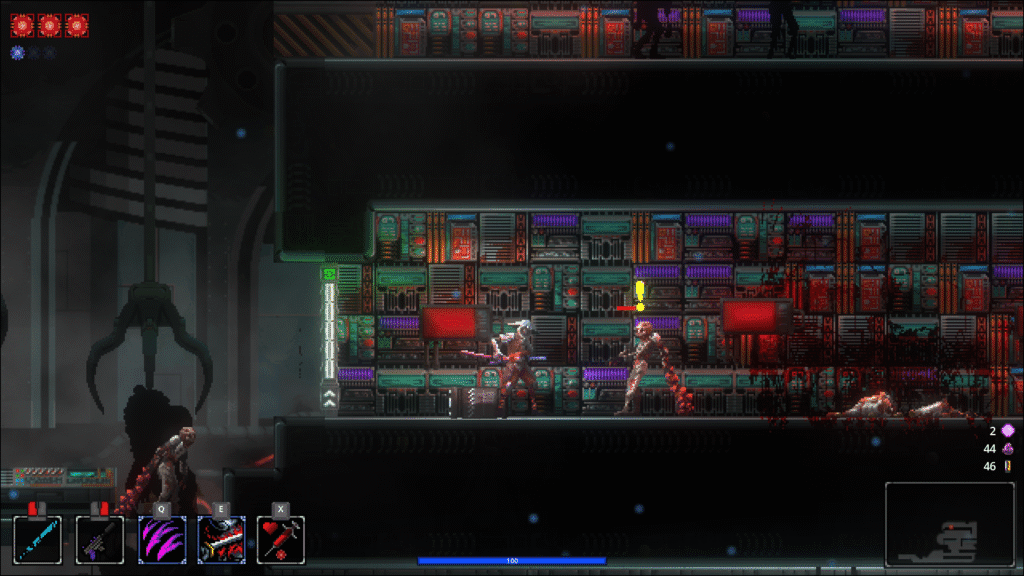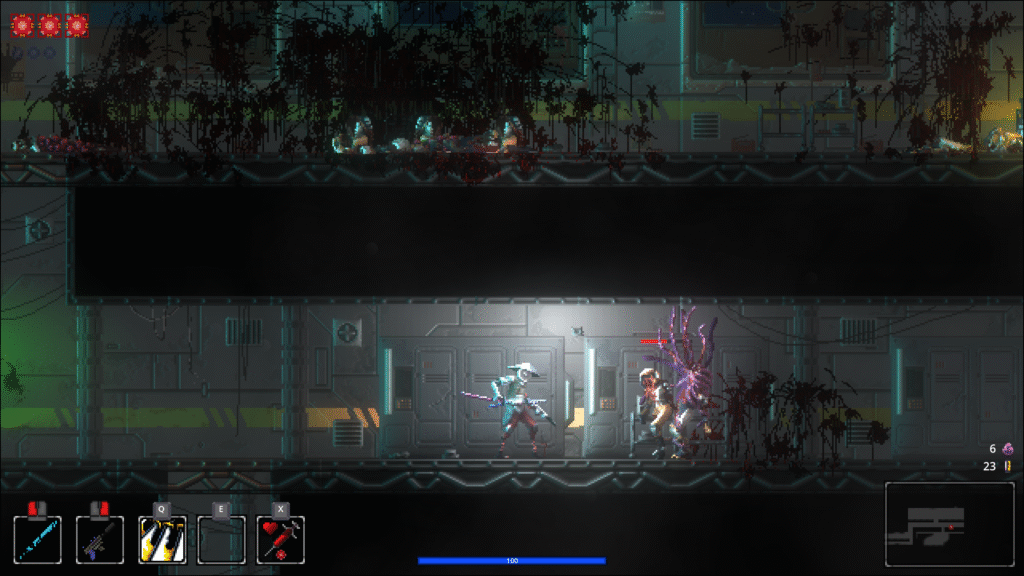 Katanaut’s pixel art presentation is nothing short of stunning, transforming sterile space station corridors into canvases of visceral horror. Blood spatters paint the backgrounds in increasingly disturbing patterns, while enemy animations strike the perfect balance between grotesque and readable. The attention to detail in creature design creates genuinely unsettling adversaries that move with unnatural fluidity, their tendril-filled maws and distorted forms adding atmospheric weight to every encounter.