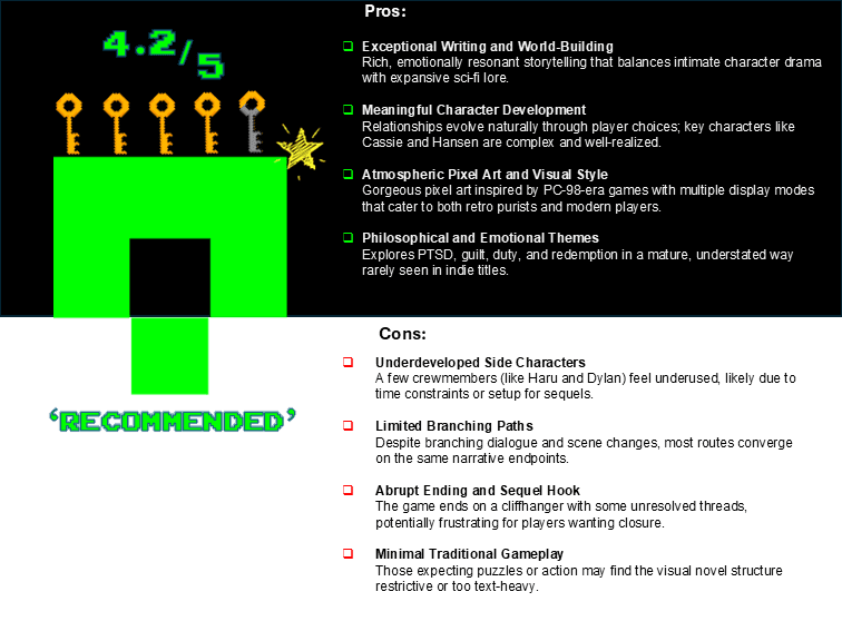 It sits near VA-11 Hall-A in emotional tone. Beside Snatcher in aesthetic. It echoes Firewatch in emotional choices, Citizen Sleeper in quiet world-building, and Disco Elysium in its respect for player intelligence.
