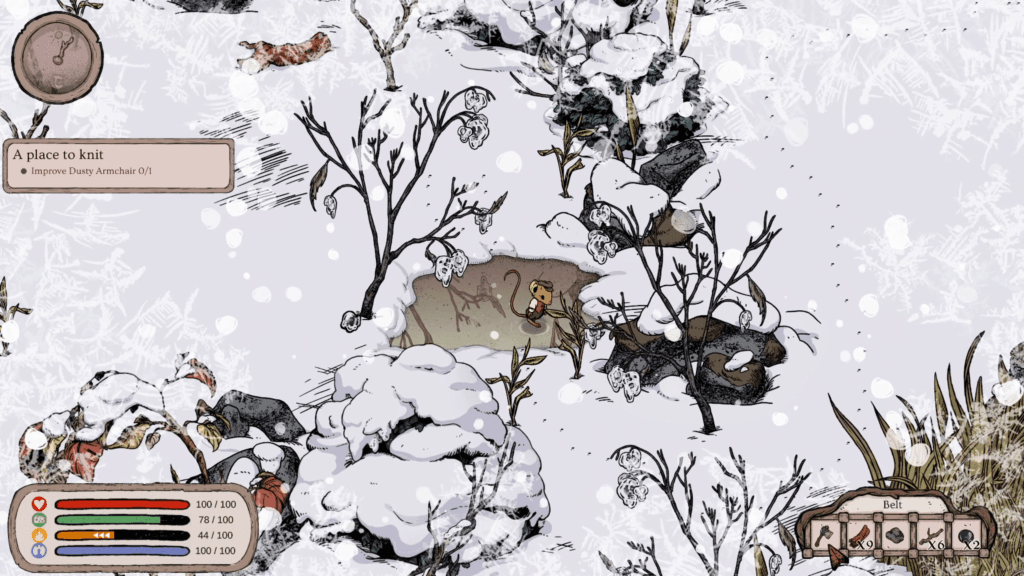 Rather than relying on surprise difficulty spikes or hidden mechanics, Winter Burrow derives its tension from trade-offs. Pushing further into the forest may yield better materials, but doing so increases exposure and fatigue. Playing conservatively is safer, but slows progress. These choices are small and frequent, and over time they establish a rhythm that feels intentional rather than stressful.